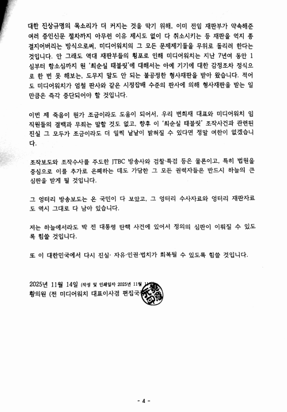 고 황의원 미디어워치 전 대표는 2025년 11월 14일 세상을 떠났다.